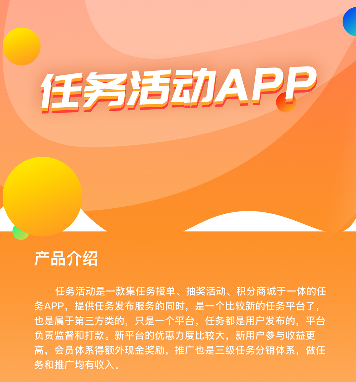 支持广告流量主联盟、任务墙、多量游戏试玩接口。同时包含三级任务分销、三级会员分销返佣机制。适合环境:APP推广注册拉新,门店小程序引流获客。广告盈利模式,任务盈利模式更多可咨询客服。